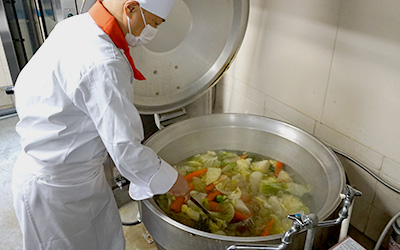 先ほどカットされた新鮮な野菜を、大きなお鍋でコトコトと煮込みます。野菜スープのいい香りがキッチンの中に漂います。