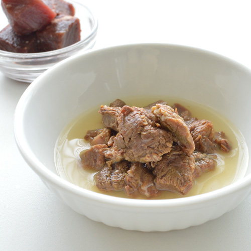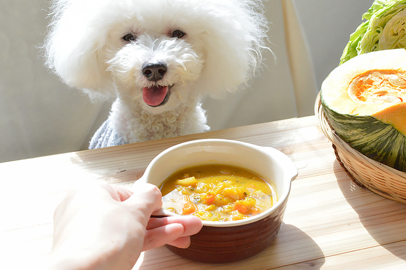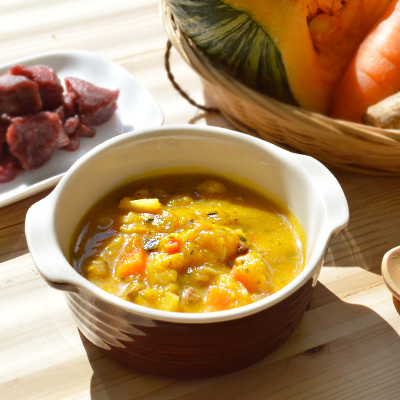 「食事で水分補給できるスープを商品に」という想いで、子犬期やシニア期のパートナーも食べやすい具だくさんのスープタイプのごはんを作りました。