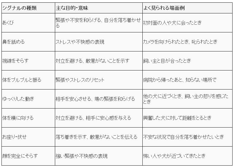 犬が使うカーミングシグナルには、さまざまな種類と意味があります。ここでは代表的なサインを一覧で紹介し、それぞれの目的を整理してみましょう。