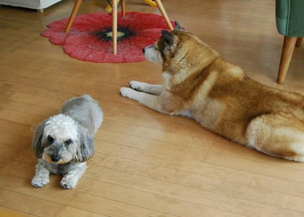 相手の目をじっと見つめるのは犬にとって対立のサイン。視線をそらすことで「争うつもりはないよ」と伝えています。人間が犬とアイコンタクトを取ろうとしたときに目を逸らすのも、同じ理由です。