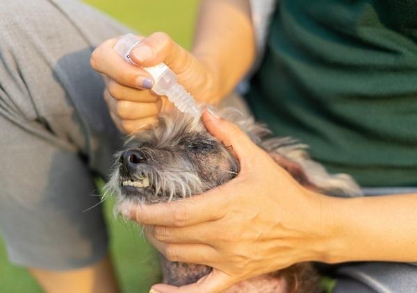 犬は目薬が近づいてくるのを見ると、それだけで身構えてしまいます。差すときは、背後や真上からできるだけ目薬が見えないようにします。