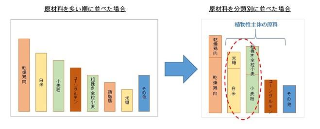 植物性原料が主体であるにもかかわらず、原材料を分割して表記することで、あたかも動物性原料が主であるかのように見せかける手法があります。例えば、「トウモロコシ」「小麦」「小麦グルテン」のように穀物を細かく分けて記載している場合は注意が必要です。