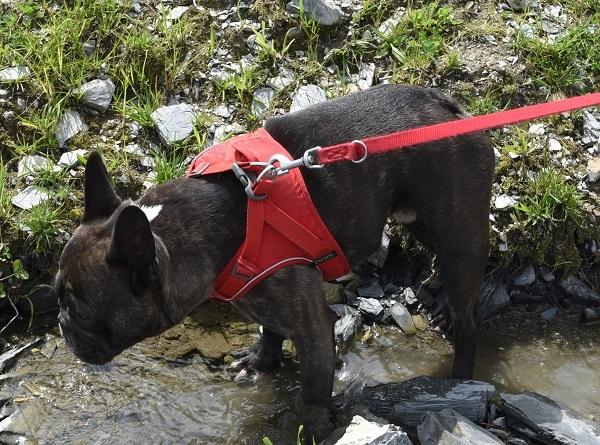 首が太く短いため、首輪が頭から抜けやすい場合や、呼吸器系に不安がある場合は、気道に負担が少ないハーネスの方が適しています。