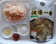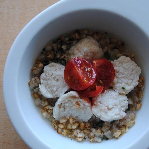 健康一番に鶏団子を煮汁ごとかけ、小さく切ったトマトを載せたら出来上がり。