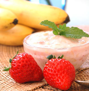 プレーンヨーグルト、細かく切ったイチゴとバナナ、はちみつを混ぜる。 -
