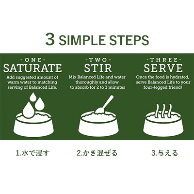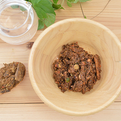 お水を注ぎ、かき混ぜて作るだけの簡単ステップで、香り際立つ、まるで生食のできあがり!見てわかる大きさのお肉やニンジン、えんどう豆などがミックスされているので、素材本来の食感が、パートナー(愛 犬)の食欲をそそります。トッピングとしてもの活用もおすすめですし、生食にチャレンジする際の第一歩や、生食ユーザーさんの備蓄食としてもおすすめしたいです。