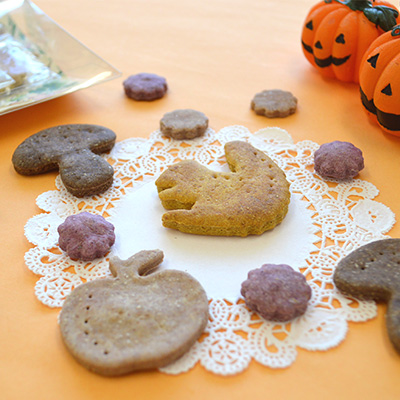 国産ハーブの中からローズヒップ、リンデン、ホーステール、セージを使用。さらに国産小麦やおから粉などをベースに、かぼちゃ、紫芋、キャロブ、ラズベリーピューレをそれぞれ練り込みました。手でパキッと割れる、カリカリした歯ごたえのハロウィン限定ビスケット。