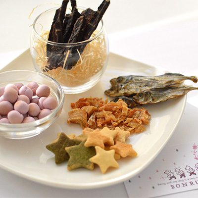 【ブルーベリーぼーろ】さつまいもペースト、馬鈴薯でんぷん、メレンゲ、蜂蜜、ブルーベリーエキス、エゾウコギ、 【星っこくっきー】小麦粉、卵、スキムミルク、砂糖、ほうれん草パウダー、苺パウダー、 【小さなささみちゃん】鶏ささみ、 【ポキポキ鹿肉】鹿肉、 【すいすいあじこさん】アジ |