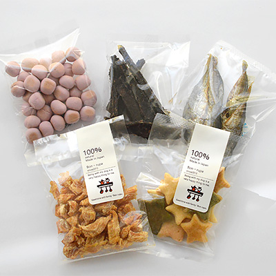 ・ブルーベリーぼーろ(15g) ・星っこくっきー(15g) ・小さなささみちゃん(15g) ・ポキポキ鹿肉(10g) ・すいすいあじこさん(5g) |