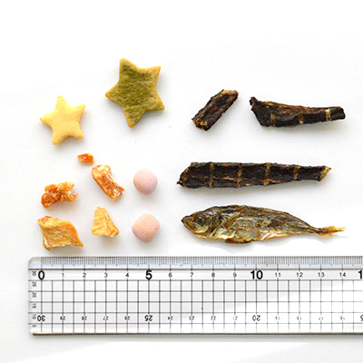 ・ブルーベリーぼーろ(15g):220kcal/100g ・星っこくっきー(15g):417kcal/100g ・小さなささみちゃん(15g):360kcal/100g ・ポキポキ鹿肉(10g):350kcal/100g ・すいすいあじこさん(5g):279kcal/100g |