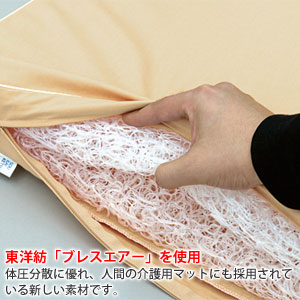 大手化学繊維メーカーの東洋紡が開発した、耐圧分散に優れ、人間の介護用マットにも使われている素材「ブレスエアー」を使用。高反発の立体的な網状構造である「エアー循環構造」で、身体がマットに沈みこまず、自然な姿勢を保つことができます。また、弾発力の高い素材なので、スプリングバネのように加重を押し戻す作用が働いて、寝返りや起き上がりもラクラク!身体が動かしやすく床ずれ防止にも役立ちます。腰への負担が少ないので、中・大型のシニア犬にもおすすめ。ブレスエアーは、ベッドに求められる4つの機能、通気性・高反発性・耐久性・清潔性(洗濯性)すべてを兼ね備えた革新的な素材です。