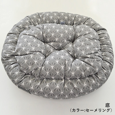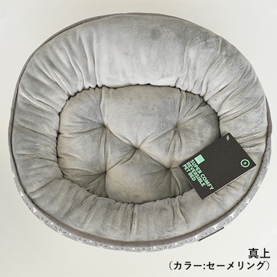 パートナーが心地よく眠れるように、ベッドの前方と後方で中綿の厚みを変えています。前方(タグのついている面)を低くすることで、肢の短いパートナーやシニアのパートナーでも出入りしやすく設計しています。また後方部分に厚みを作ることであごを乗せてリラックスしやすいように配慮されています。パートナーの心地よさを第一に考えた設計にこだわりぬいたベッドです。