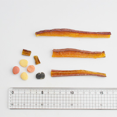【ゆのさんちのお芋】粗タンパク質:1%以上 粗脂肪:0.5%以上 粗繊維:2%以下 粗灰分:3%以下 水分:12%以下 【カラフルクッキー】粗タンパク質:14.5%以上 粗脂肪:8.6%以上 粗繊維:2.0%以下 粗灰分:1.0%以下 水分:6%以下 |