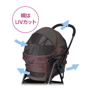 少し大きめのパートナーも、ゆったり快適な大きめサイズのペットカート。幌がしっかりと大きく開き、パートナーの出入りもラクラクです。