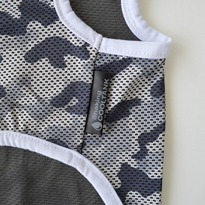 シェーキングクールタンクは、特許技術「クールコアテクノロジー」を採用したウェア。米国をはじめ、世界各国で特許を取得した、冷感をもたらす革新的な機能性素材です。生地は3層構造になっており、吸収された水分が振動し、蒸発冷却することで生地の温度が下がります。独自開発の3種類の糸により「気化熱」を効果的に発生させます。濡らして絞って振るだけでひんやり。ひんやり感がなくなってきたな…と感じたら、再び濡らして振れば何度でもひんやり感がよみがえります(生地に水分が含まれていれば振るだけでOK)。ちなみに、人用の商品ではスポーツやアウトドアシーンなどを中心に、世界約30か国で愛用されています。
