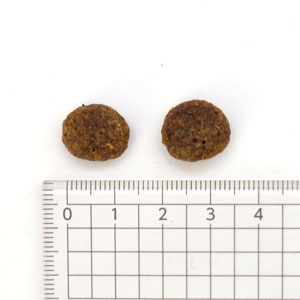 | 成分値 | タンパク質:24%以上、脂質:12%以上、粗繊維:4.5%以下、灰分:6.4%以下、水分:10%以下、カルシウム:1.2%以上、リン:1%以上、オメガ6脂肪酸:1.50%以上、オメガ3脂肪酸:0.90%以上 |