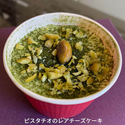 素材 【ピスタチオのレアチーズケーキ】カテージチーズ、生クリーム、ヨーグルト、フラクトオリゴ糖、鶏卵、薄力粉、ピスタチオ、大麦若葉、キャノーラ油、アガー、レモン果汁 、