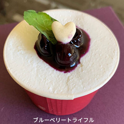 【ブルーベリートライフル】カテージチーズ、鶏卵、ヨーグルト、薄力粉、ブルーベリー、キャノーラ油、片栗粉、レモン果汁、ミント 、