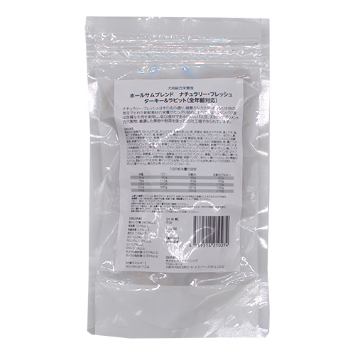 | 素材 | 骨抜き七面鳥肉、白いんげん豆、えんどう豆、乾燥全卵、はと麦、菜種油、骨抜きウサギ肉、唐人びえ、亜麻仁、天然香味料、キヌア、塩、乾燥チコリ根、酵母エキス、りんご、にんじん、クランベリー、ほうれん草、さつま芋、大麦若葉、トマト、乾燥バチルス・サブティリス発 酵産物、乾燥バチルス・リケニホルミス発酵産物、乾燥ラクトバチルス・アシドフィルス発酵産物、乾燥ラクトバチルス・カゼイ発酵産物、乾 爆ビフィドバクテリウム・ビフィダム発酵産物、乾燥エンテロコッカス・フェシウム発酵産物、乾燥アスペルギルス・オリゼ発酵産物、ビタミン類(塩化コリン、ビタミンEサプリメント、L-アスコルビン酸-2-ポリリン酸、ナイアシン、βカロテン、D-パントテン酸カルシウム、ビタミンAサプリメント、リボフラビン、ビタミンB12サプリメント、チアミン硝酸塩、ピリドキシン塩酸塩、ビタミンD3サプリメント、葉酸)、ミネラル類(リン酸ニカルシウム、炭酸カルシウム、硫酸亜鉛、硫酸鉄、硫酸銅、硫酸マンガン、亜セレン酸ナトリウム、ヨウ素酸カルシウム、亜鉛タンパク化合物、銅タンパク化合物、マンガンタンパク化合物、鉄タンパク化合物)、トリポリリン酸ナトリウム、酸化防止剤 (ミックストコフェロール) |