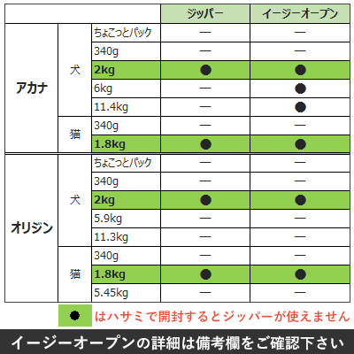 アカナ・オリジン製品は、一部のサイズに限り「イージーオープン袋」が採用されております。ハサミ等を使用せずに、ツマミをゆっくりと引くだけで開封が可能です。対象商品は袋表面の上部に『EASYOPEN』の表記がございます。