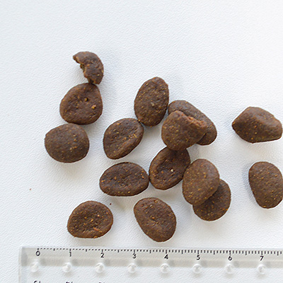 こちらの商品はタンパク質の配合量が多いために成形が難しく、一粒ひとつぶの形状がいびつになっています。品質や中身に問題はございません。予めご了承ください。